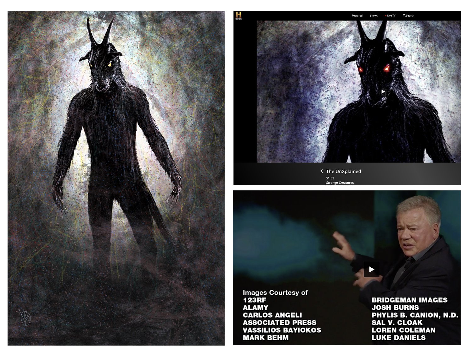 The piece is called GOAT DE-MHAN. A digital illustration portraying a half man and half goat demonic creature. It was shown in episode 3 that discussed “Strange Creatures”. Irony? I did this as a pitch for another assignment and it was flatly rejected. However, I posted it on Artstation.com (forum for digital illustrators), and immediately I was contacted by a producer who wanted that image in that chapter. This would lead to some more commissions for later episodes.